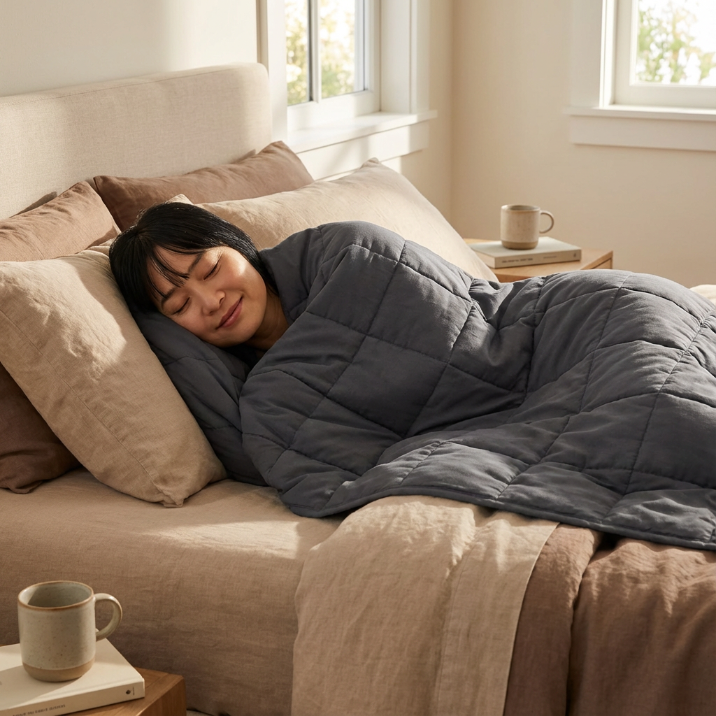 Die Gewichtsdecke beruhigt dein Nervensystem durch sanften, gleichmäßigen Druck. Dadurch kannst du schneller abschalten, fühlst dich innerlich ruhiger und schläfst tiefer und erholsamer – ganz natürlich und ohne Aufwand.